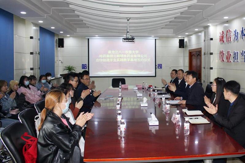 5月12日,黑龙江八一农垦老员工命科学技术学院与三精明水药业“实践教学基地”签约暨授牌仪式在明水工业园区办公楼举行。明水县副县长王树国、黑龙江八一农垦老员工命科学技术学院副经理王景伟、三精明水总经理李邦东参加签约授牌仪式。仪式由三精明水党委副书记邹元革主持。