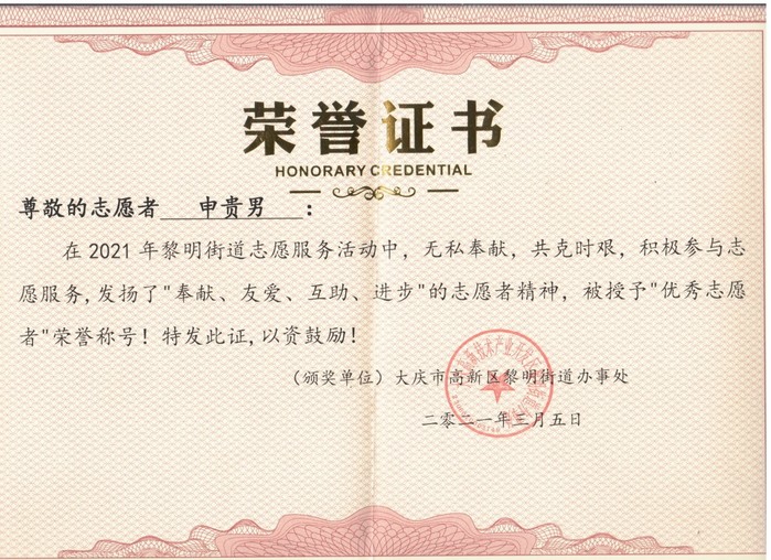 志愿服务人人可为、事事可为、时时可为,申贵男老师志愿服务的身影不止在抗疫中出现。在银河太阳城居委会做选举动员活动时,他主动请缨协助参与动员,他耐心细致地向居民讲解选举工作的重要意义,圆满完成了选举传达任务,得到了高新区黎明街道办事处的高度认可,授予他“优秀志愿者”荣誉称号。