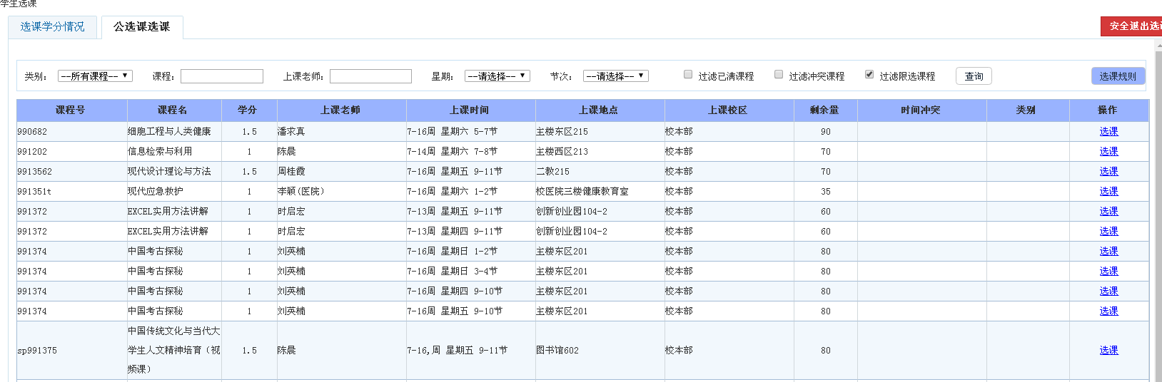 第四步:点击“公选课选课”,进入选课课程页面。会显示选课课程的各个选课项目、授课教师、上课时间等基本信息,确定好所选课程后,点击选课,系统提示选课成功,能够查看到所选课程,即完成课程的选课。