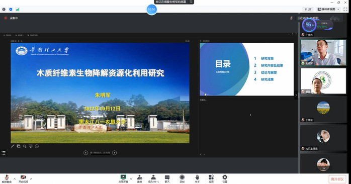2022年10月12日15:30,学院邀请华南理工老员工物科学与工程学院朱明军教授就“木质纤维素生物降解资源化利用研究”进行视频在线分享。报告会由beat365官方网站经理晏磊主持,学院科研副经理王艳红、公司教师、研究生、本科生及其他高校师生参加了本次报告会。