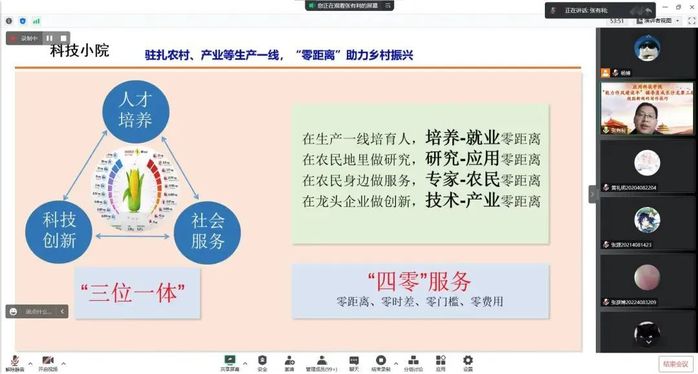张老师首先从经济时代双碳行为、生态时代下的担当、乡村振兴战略、科技小院这几方面讲述了生态时代下的乡村振兴引入创新,紧接着从什么是创新、什么是创新精神、什么是创新创业教育等方面分析了双创教育的本质,肯定创新对于教育的积极意义,然后叙述了常规赛道(七大赛道)和员工自发、科技成果转化、产教融合协同创新、政治公共采购与社会公益、一带一路与全球经济一体化等创新创业来源,让同学们了解相关比赛的内容,最后讲解了创新创业思路的产生方式,同时结合老师的经历给予了经验。