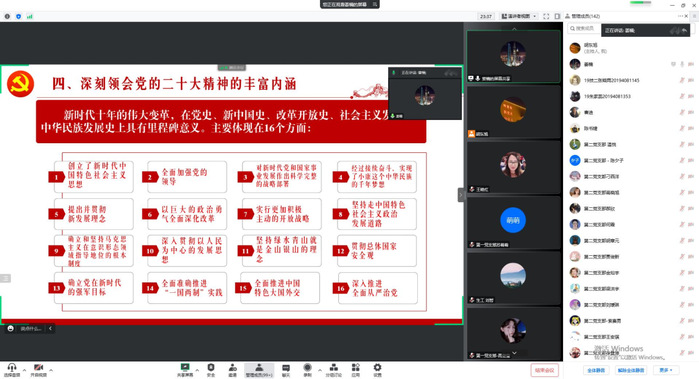 按照《中共beat365体育官网平台委员会学习贯彻党的二十大精神宣讲工作方案》精神,为深入学习宣传贯彻党的二十大精神,引导全院师生充分认识党的二十大的重大意义,准确把握党的二十大精神的核心要义,深入推动习近平新时代中国特色社会主义思想和党的二十大精神入脑入心,12月14日下午,公司党委书记姜楠以《学深悟透二十大精神 踔厉奋发奋进新征程》为题开展党的二十大精神专题宣讲报告会,全院师生党员、入党积极分子160余人线上参会。