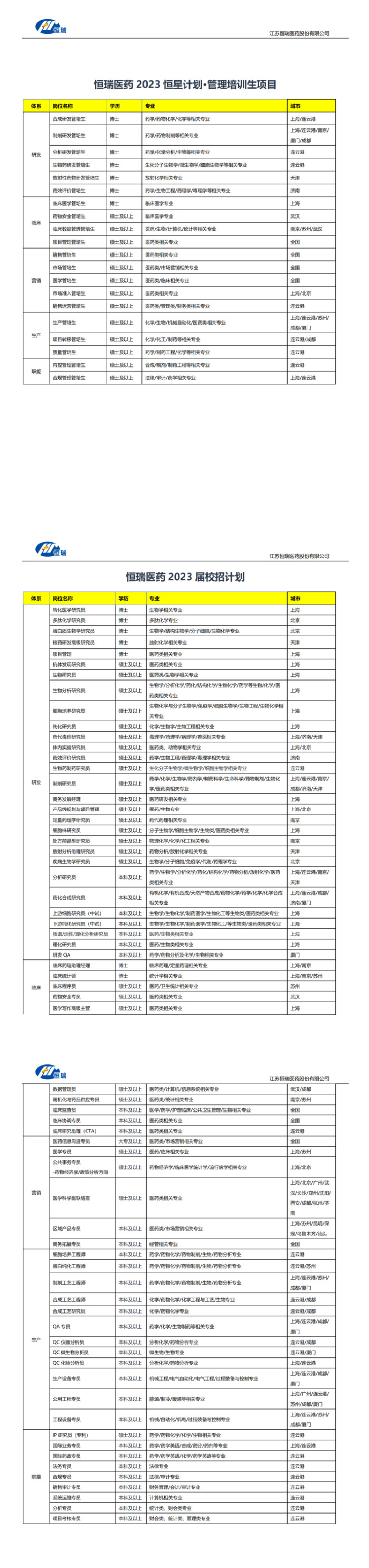 招聘信息|江苏恒瑞医药股份有限公司2023校园招聘