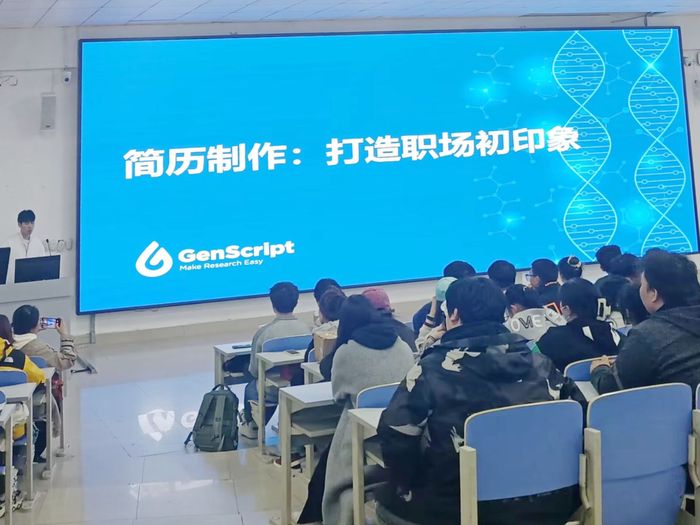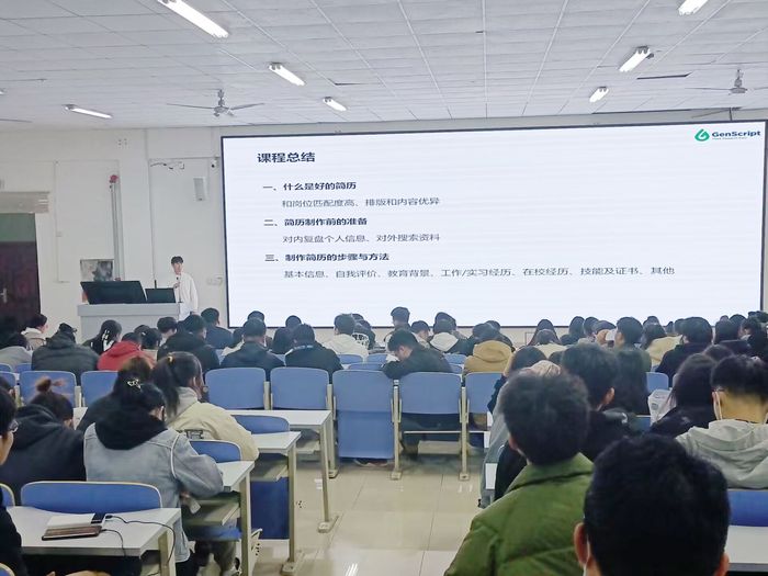 本次活动由南京金斯瑞生物科技股份有限公司面向公司全体2024届毕业生及理学院应用化学专业毕业生开展,金斯瑞生物科技股份有限公司是全球重要的生命科学研就业指导发与生产服务提供商。企业代表向公司员工阐述了公司的发展进程,主营业务、未来发展方向、晋升通道及福利待遇,员工积极互动,现场氛围热烈。(如图二)