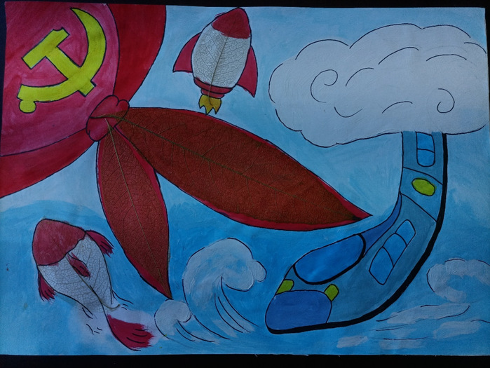 整个作品由卡通人,交通工具,红领巾组成。交通工具象征着中国科技发展,红领巾和卡通人诠释着在如此时代的我们时谨记听党话,跟党走,不掉队,少年的明天就是祖国的明天。
