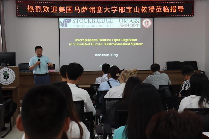 2023年6月27日下午,学院邀请美国马萨诸塞大学邢宝山教授来院交流指导,在学院学术报告厅,邢教授为广大师生作题为“微塑料降低模拟人类胃肠系统中的脂肪消化”的学术报告。报告会由beat365官方网站经理晏磊主持,学院教师、研究生、本科生参加了本次报告会。