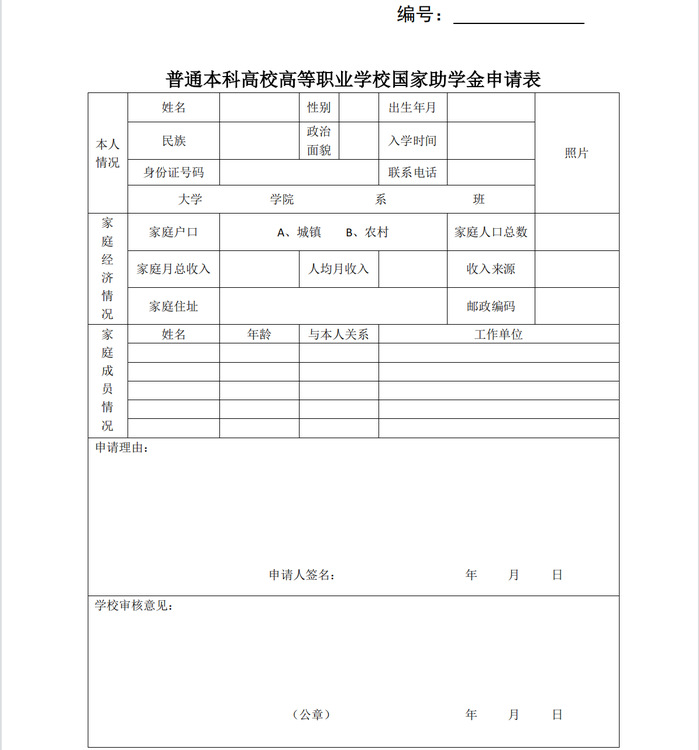 (一)国家助学金按学年申请和评审。家庭经济困难员工根据国家助学金申请条件,向所在学院提交《普通本科高校、高等职业学校国家助学金申请表》。