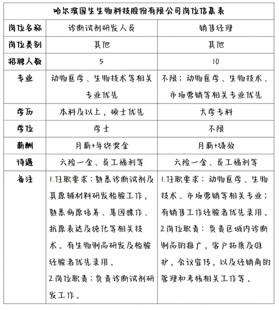 哈尔滨国生生物科技股份有限公司(动物用生物制品国家工程研究中心)是经国家发改委批准,由中国农业科学院哈尔滨兽医研究所牵头,兆丰华生物科技(南京)有限公司、哈尔滨维科生物技术有限公司、北京中海生物科技有限公司、哈药集团有限公司企事业单位,共同组建的科技型高新技术企业,承担着疫苗、治疗性生物制剂和诊断制品研发和孵化任务。公司已获得多项新兽药注册证书,生产的诊断制品覆盖了猪、牛、羊、禽的主要传染病免疫学检测和分子生物学检测。