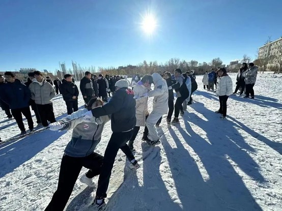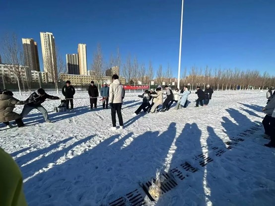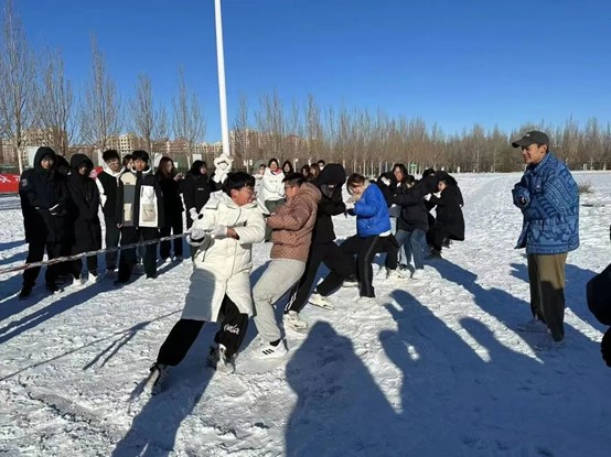 当比赛的哨声响起,队员们口中一起高呼着“一二!一二!”双手握紧长绳,憋足了劲拼命往后拉,虽然冬日寒冷,但仍然抵挡不住同学们激昂澎湃的心。不管是男生还是女生,大家都齐心协力,永争第一!未参赛的同学自发形成啦啦队在旁边加油呐喊,哨子声、呐喊声此起彼伏。比赛异常激烈,双方难分高下,很快进入了拉锯战。经过一段时间的白热化的比赛之后,每个人几乎用尽了身上所有的力气,但没有人想放弃,大家心中都怀有一份信念,那就是坚持不放弃!