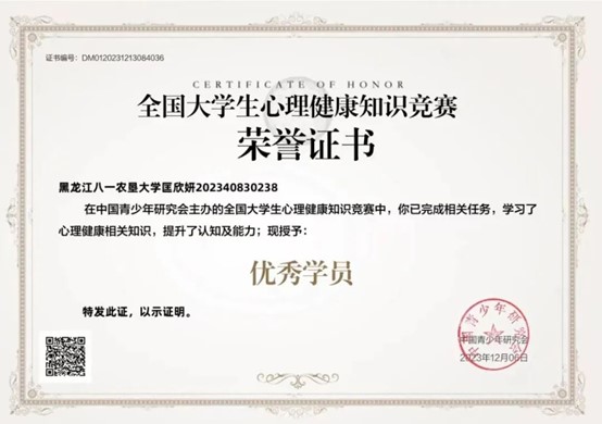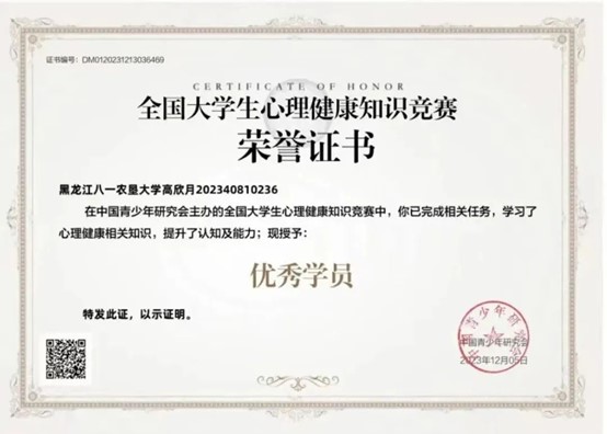 活动期间,同学们积极进行心理健康知识竞赛答题,并获得了全国老员工心理健康知识竞赛荣誉证书。通过完成心理健康知识答题,提高了同学们对心理健康的关注度,加强了对自身的认知,以阳光积极的心态面对生活。