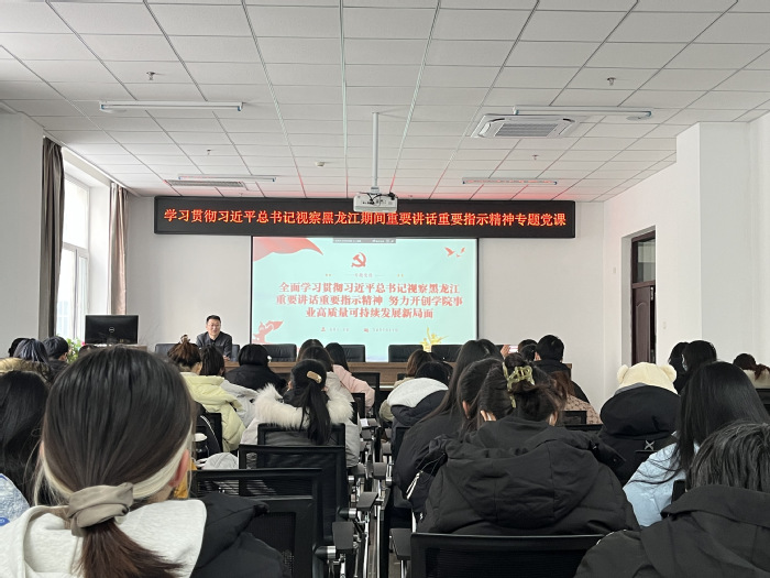 姜楠以《努力开创学院事业高质量、可持续发展新局面》为题,从深刻认识习近平总书记视察黑龙江、擘画新时代新征程全面振兴宏伟蓝图的重大里程碑意义,坚定不移沿着总书记指引的方向勇毅前行;深刻领会习近平总书记重要讲话重要指示的丰富内涵和实践要求,切实肩负起新时代新征程龙江振兴发展的使命任务;学习贯彻习近平总书记重要讲话重要指示精神,奋力开创学院高质量可持续发展新局面三个方面作专题党课。