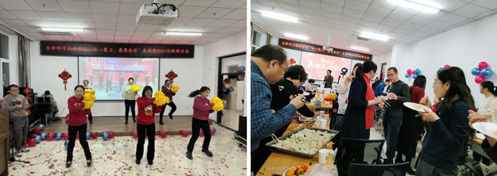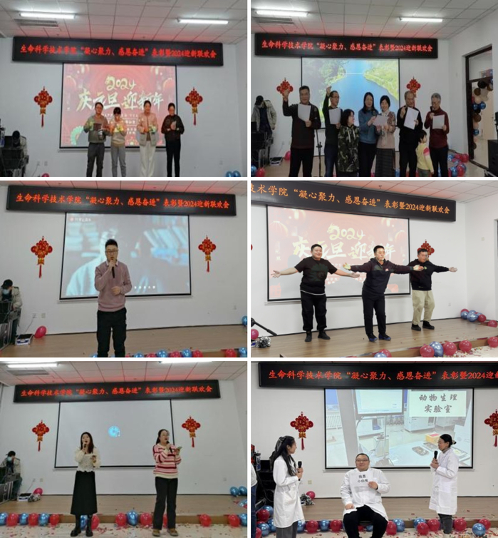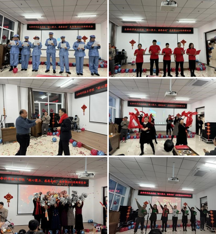 活动现场教职工还精心准备了文艺演出,院办带来了合唱《革命人永远是年轻》、诗朗诵《至平凡而伟大的生命人》、独唱《惜别的海岸》;生物技术系教师以东北秧歌《欢乐中国年》开场,又带来了《国家》、《星辰大海》手指舞串烧;生物科学系教师表演了精彩的语言类节目《我爱上班》、《三句半》;生物工程系教师合唱《感恩的心》、《祝福祖国》;实验中心根据实验教学过程中趣事改编情景剧《实验中心趣闻》;辅导员团队更是展现了青春活力,带来了舞蹈《科目三》和歌曲《如愿》;制药工程系韩通老师独唱《东北民谣》,最后以集体舞《恭喜发财》结束本场演出。
